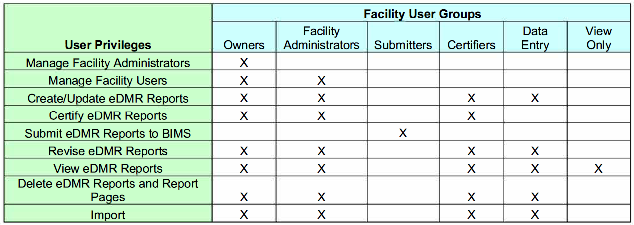After the Owner gets an eDMR account set up, that person has the option to set up Facility Administrator, Data Entry, Certifier, and View Only Users in the eDMR system. Facility Administrators can set up Data Entry, Certifier, and View Only Users in the eDMR system. This step is not required.