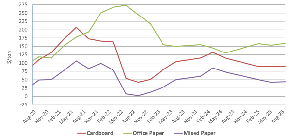 RBAC tracks pricing trends for basic recyclable commodities. Market pricing is gathered through contact with three recycling processors located in the eastern, central and western regions of the state. The graphs and data presented include pricing trends for the past five years.