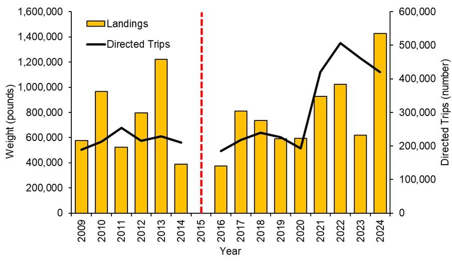 After an initial drop in landings when management was implemented in 2015, landings have shown an increasing trend (and been on par with pre-regulation values; Figure 1). Recreational landings in 2024 were 1.42 million pounds, the highest since management was implemented, the highest of the time series shown, and the second highest recorded recreational landings (behind 2007, see annual update).