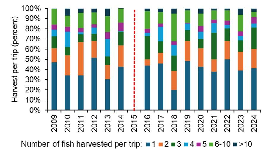 Though the majority of anglers only land one fish, in the last 5 years there has been a slight increase in the proportions of anglers landing 2-4 fish (Figure 2). This change in success, even slight, likely contributed to the observed increase in landings. Increased success coupled with increased effort and interest (both realized and anecdotal) raises concerns about harvest levels and current management.
