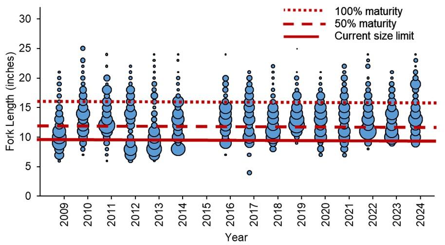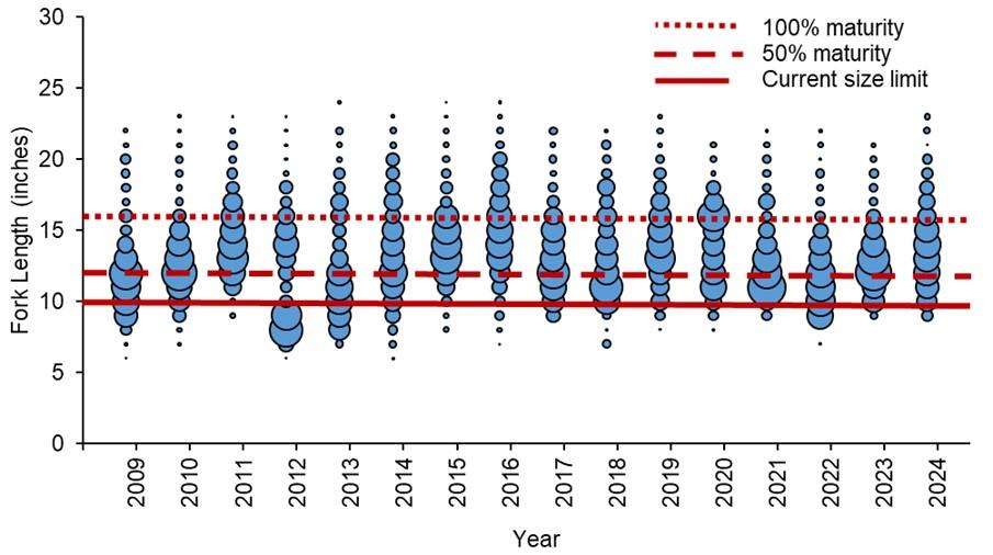 Figure 3. Length frequency of sheepshead harvested in the recreational fishery. The larger the bubble the more fish that were observed at that length, and the dark red horizontal bars represent the current 10-inch fork length minimum size limit, and size at 50% and 100% maturity.