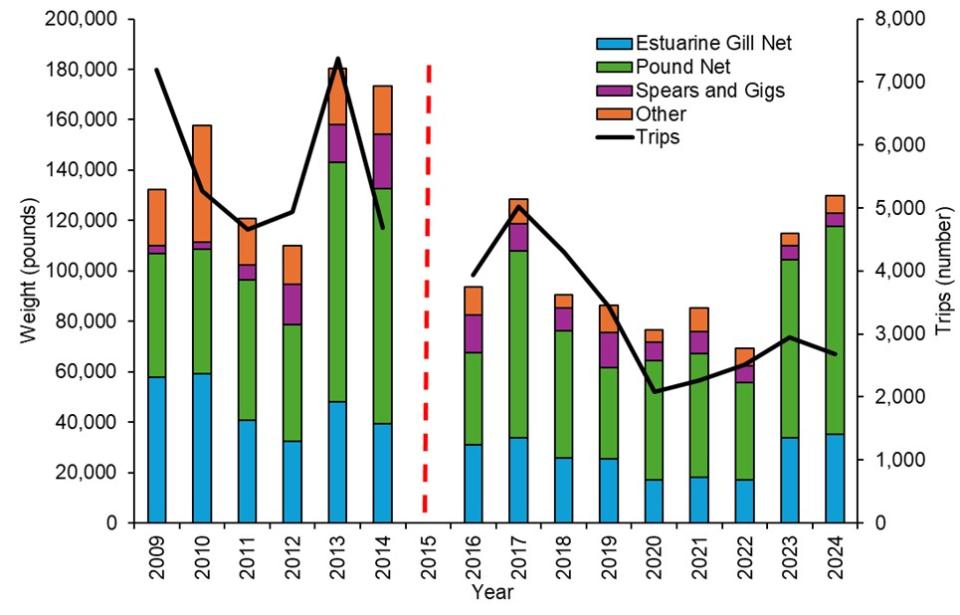 Figure 4. Annual sheepshead commercial landings (pounds, left axis) by gear type and trips (number, right axis), 2009–2024. Data from 2015 were excluded due to timing of management implementation part way through the year. (Source: North Carolina Trip Ticket Program).