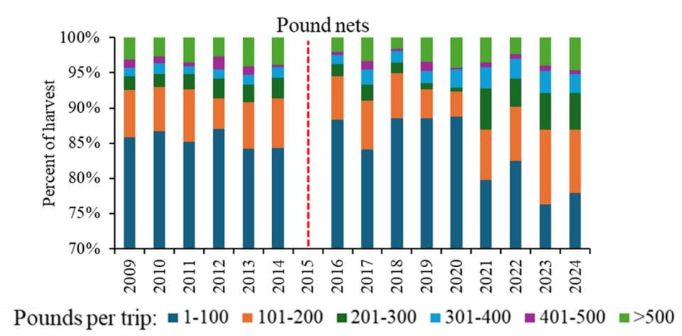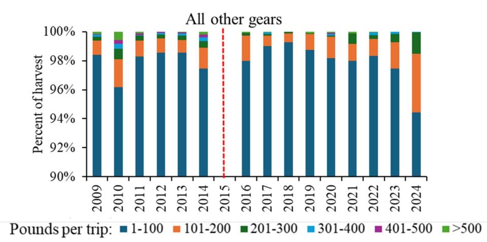 Figure 5. The proportion of commercial sheepshead harvest for pound nets (top) and other gears (excludes gig/spear; bottom) where bar color refers to the range of pounds (e.g., 0-100 lb) harvested per trip, 2009–2024.