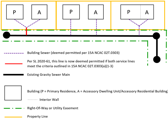 SL 2020-61 applies to either existing residential structures which will be newly connected by a shared sewer line, or for new construction where either a new accessory building is joined with an existing primary residence, or where two such residential structures are built concurrently.